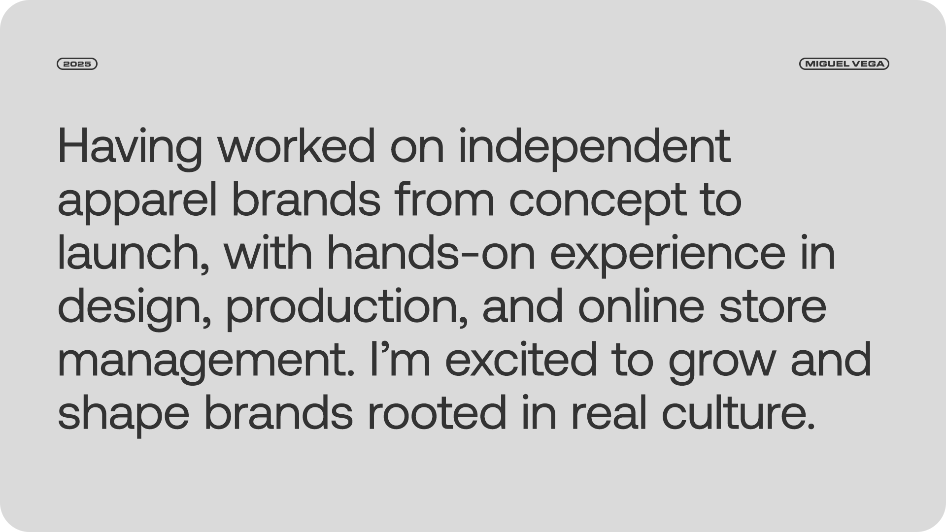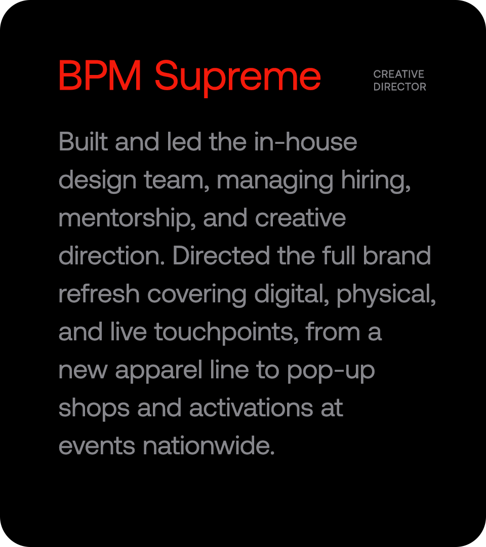 I'm Miguel, a senior creative blending design, culture and flair, to help lifestyle-brands build strong identities, shape apparel and tell stories that connect.